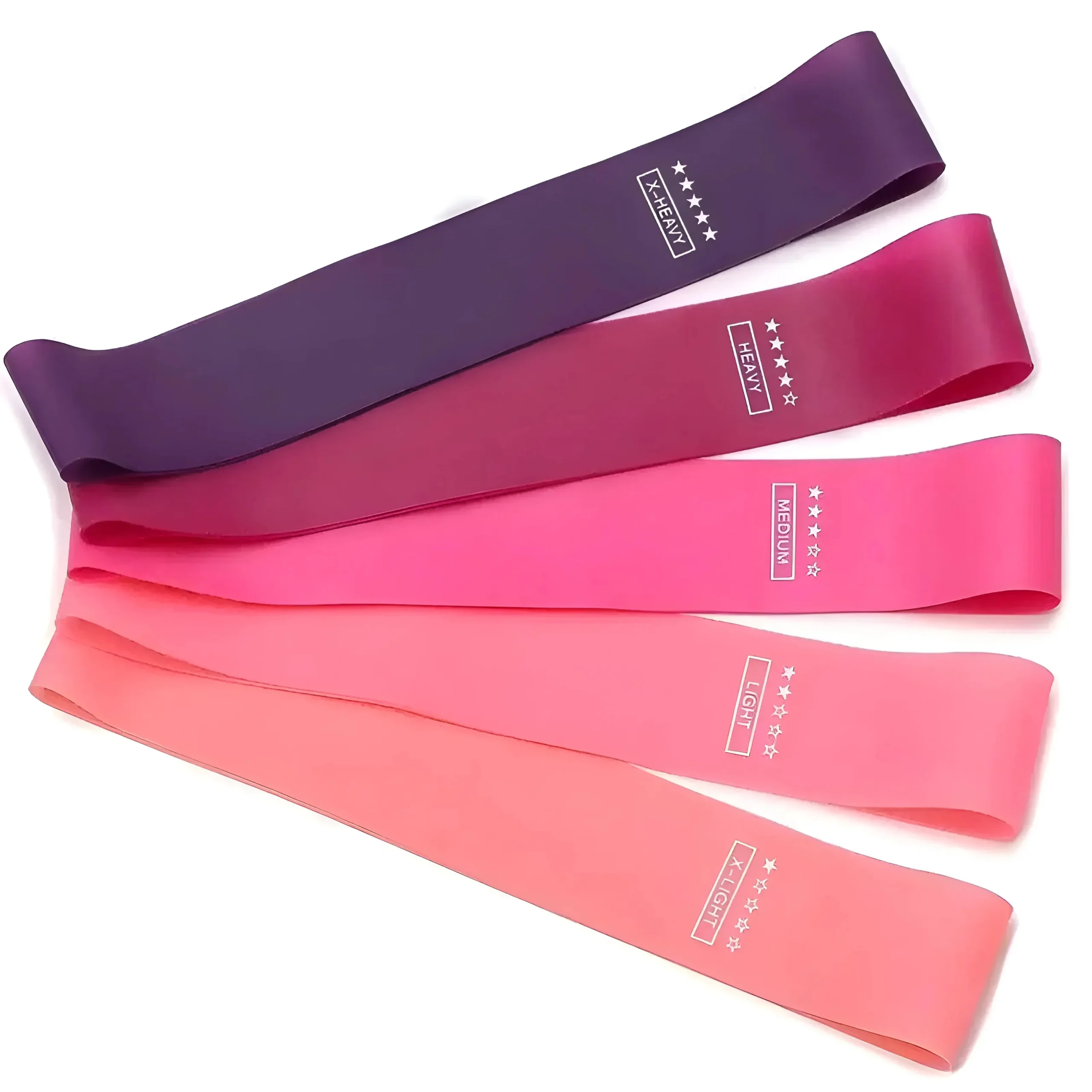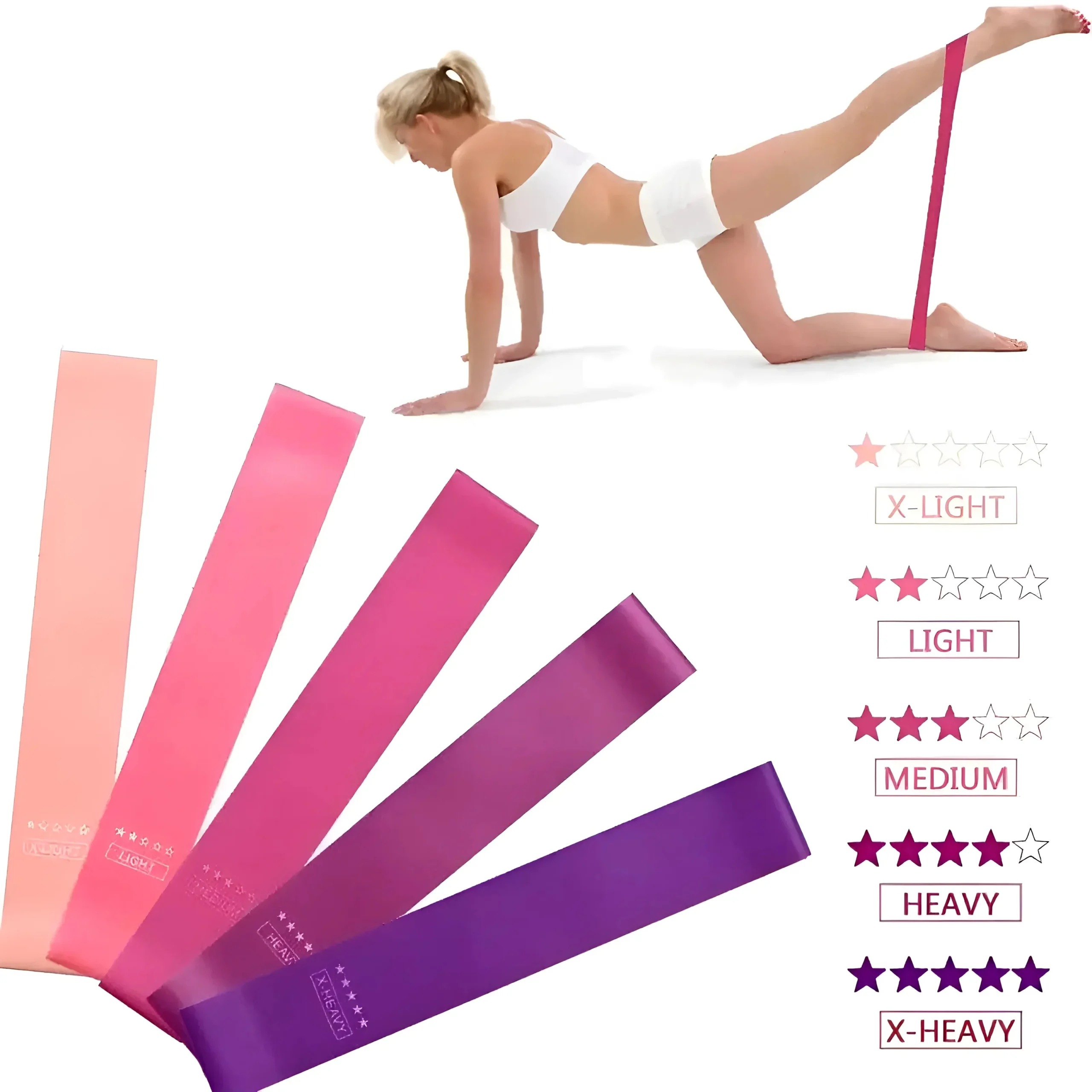 Ensemble de cinq bandes de résistance de styles variés. Bandes étiquetées avec des niveaux de résistance : X-Léger, Léger, Moyen, Lourd, X-Lourd. Image d’une personne démontrant un exercice avec une bande. Les bandes sont plates et en boucle, adaptées à divers exercices. Couleurs disponibles : Rose, Rose foncé, Orange, Bourgogne, Violet. Libérez votre force et […]