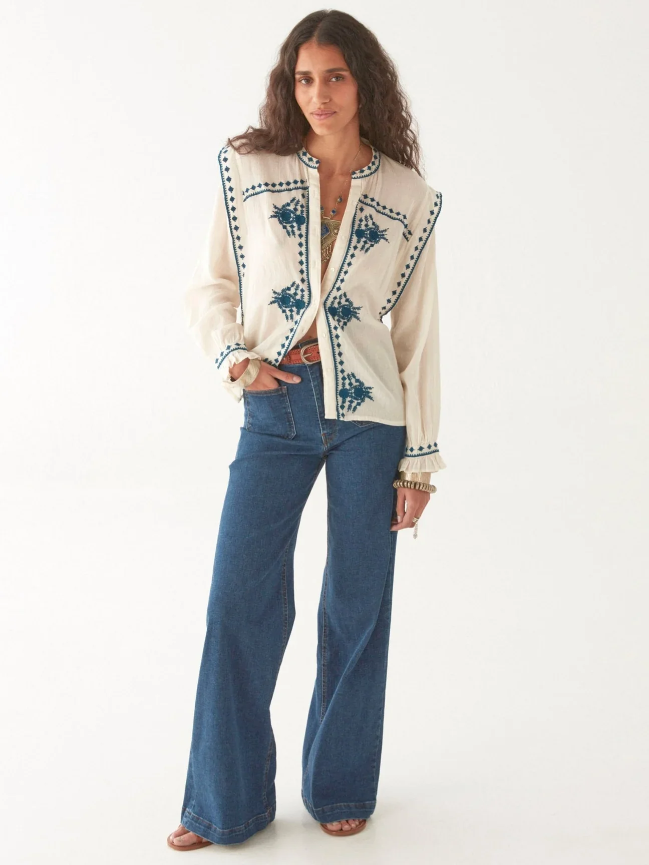 Une petite chose trompeuse. Ce coton ivoire doux pourrait suggérer l’innocence, mais le diable est dans les détails – une broderie indigo tranchante qui se fraye un chemin sur le devant, à travers les poignets, et tranche à travers le joug occidental comme si elle avait quelque chose à dire.