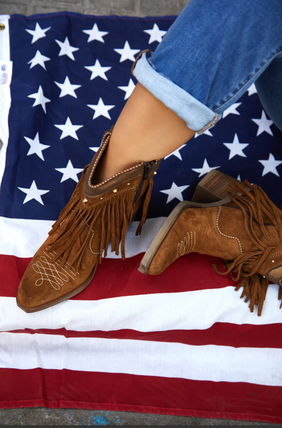 BOTTINE COWBOY À FRANGES EN CUIR VELOURS COULEUR CUIR AVEC DOUBLURE EN CUIR. SEMELLE SYNTHÉTIQUE TR TALON 5 CM