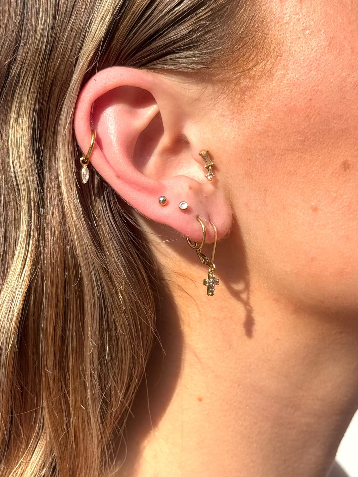 Réalisée en laiton plaqué or 18K (3 microns), la boucle Croix est rehaussée de micro-strass sertis, ajoutant une touche de lumière délicate sans ostentation. Inspirée par les symboles sacrés, elle se porte comme une croix-talisman contemporaine.