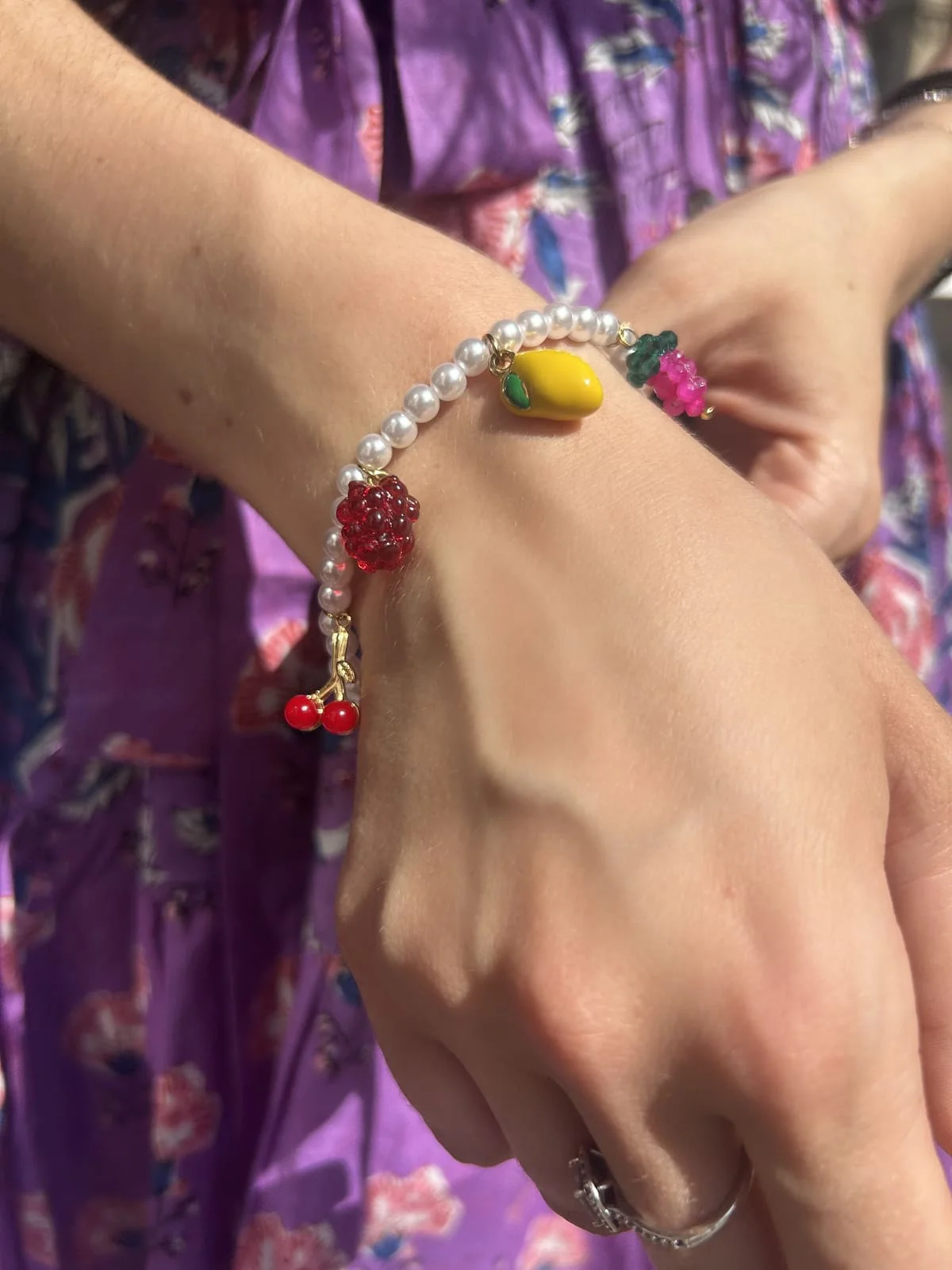 Pour un look d’été qui respire le fun, combinez ce bracelet avec un short en jean taille haute, un débardeur blanc, des sandales dorées et un panier en osier. On peut le porter avec des colliers dorés fins et le Collier Multi-Fruits pour un effet total look fruité. Et pour sortir, une robe à motifs floraux fait toute la différence
