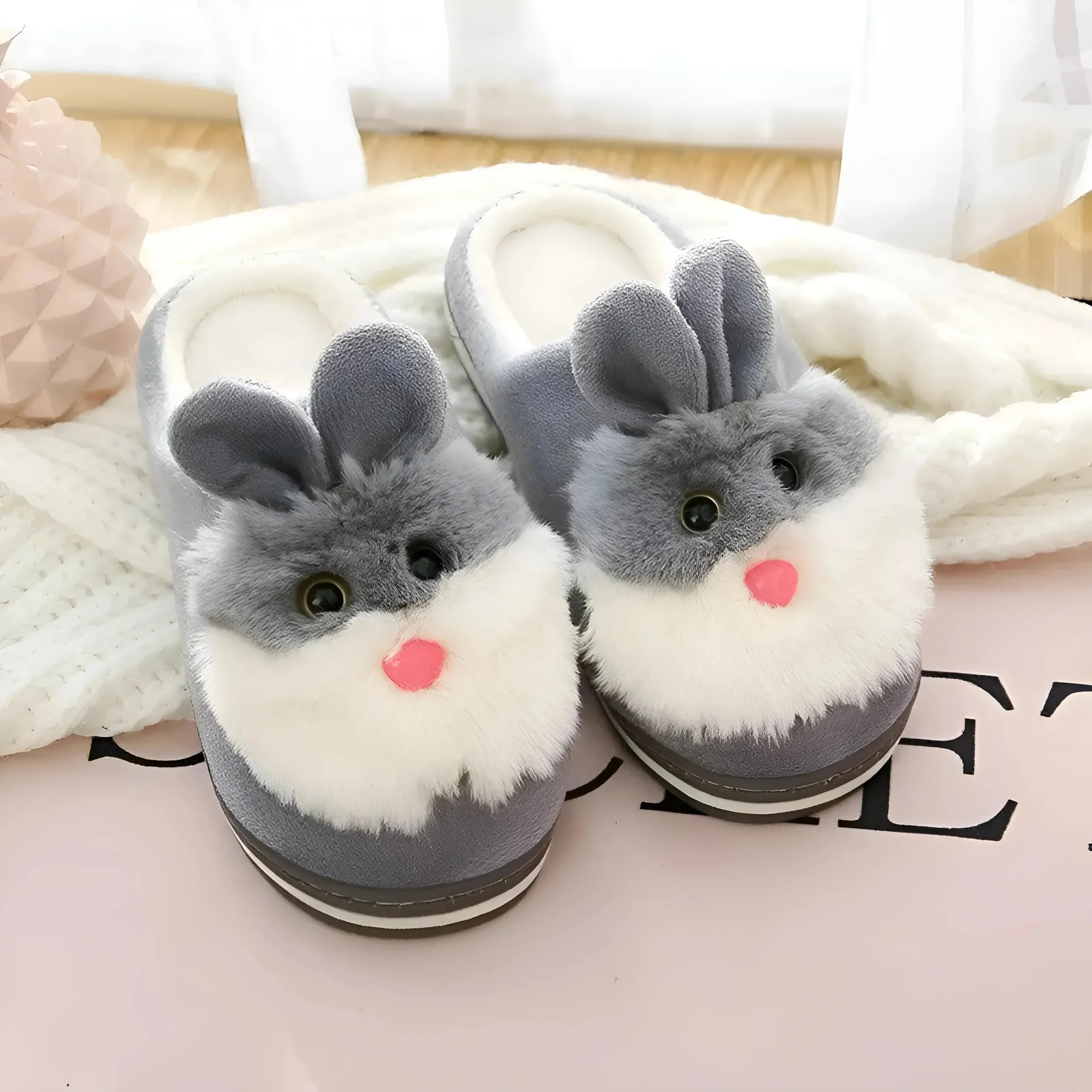 Entrez dans le confort et la mignonnerie avec nos adorables chaussons de lapin, dotés d’accents en fourrure douce et de charmantes oreilles de lapin. Offrez-vous l’étreinte la plus douce en rose ou en gris—vos pieds méritent ce délice douillet !