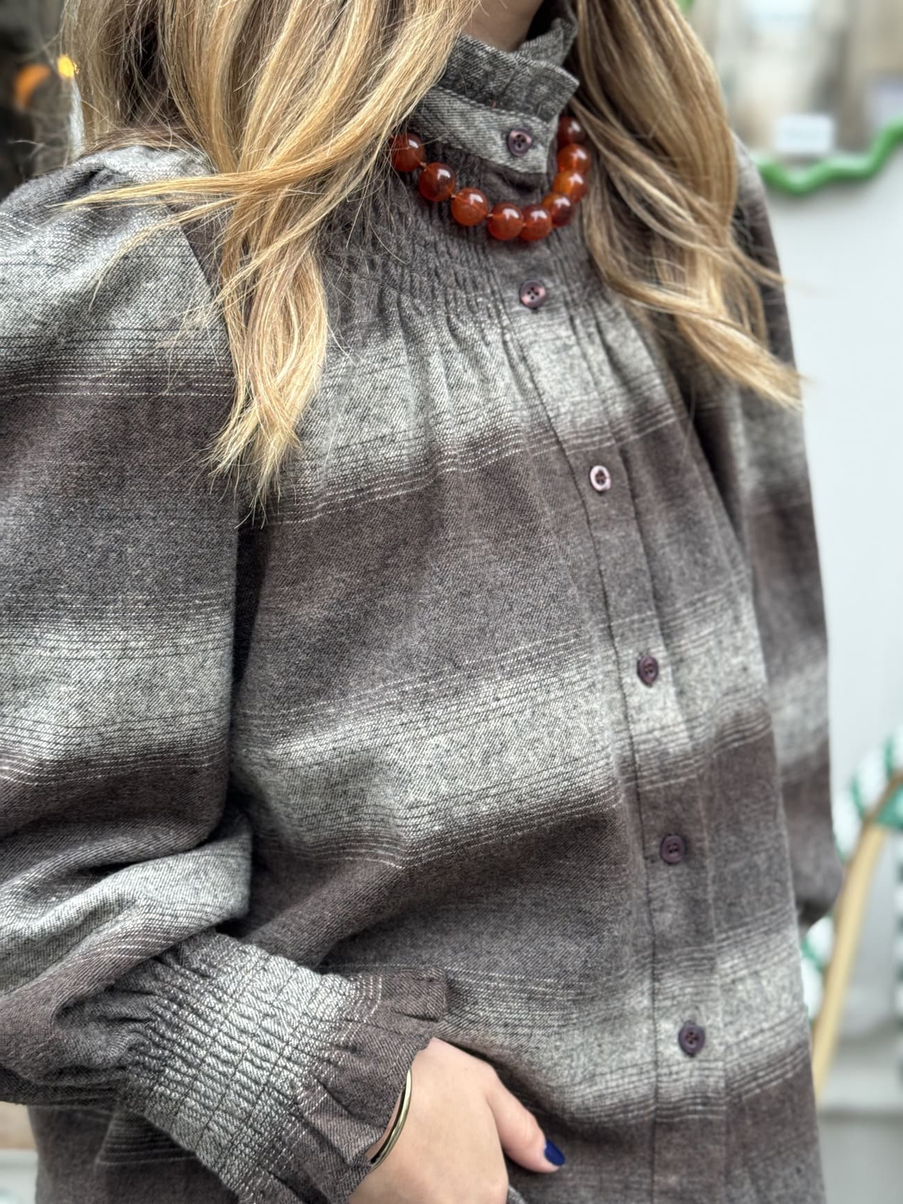 Le col victorien et les manches smokés à volants qui apportent légèreté et élégance