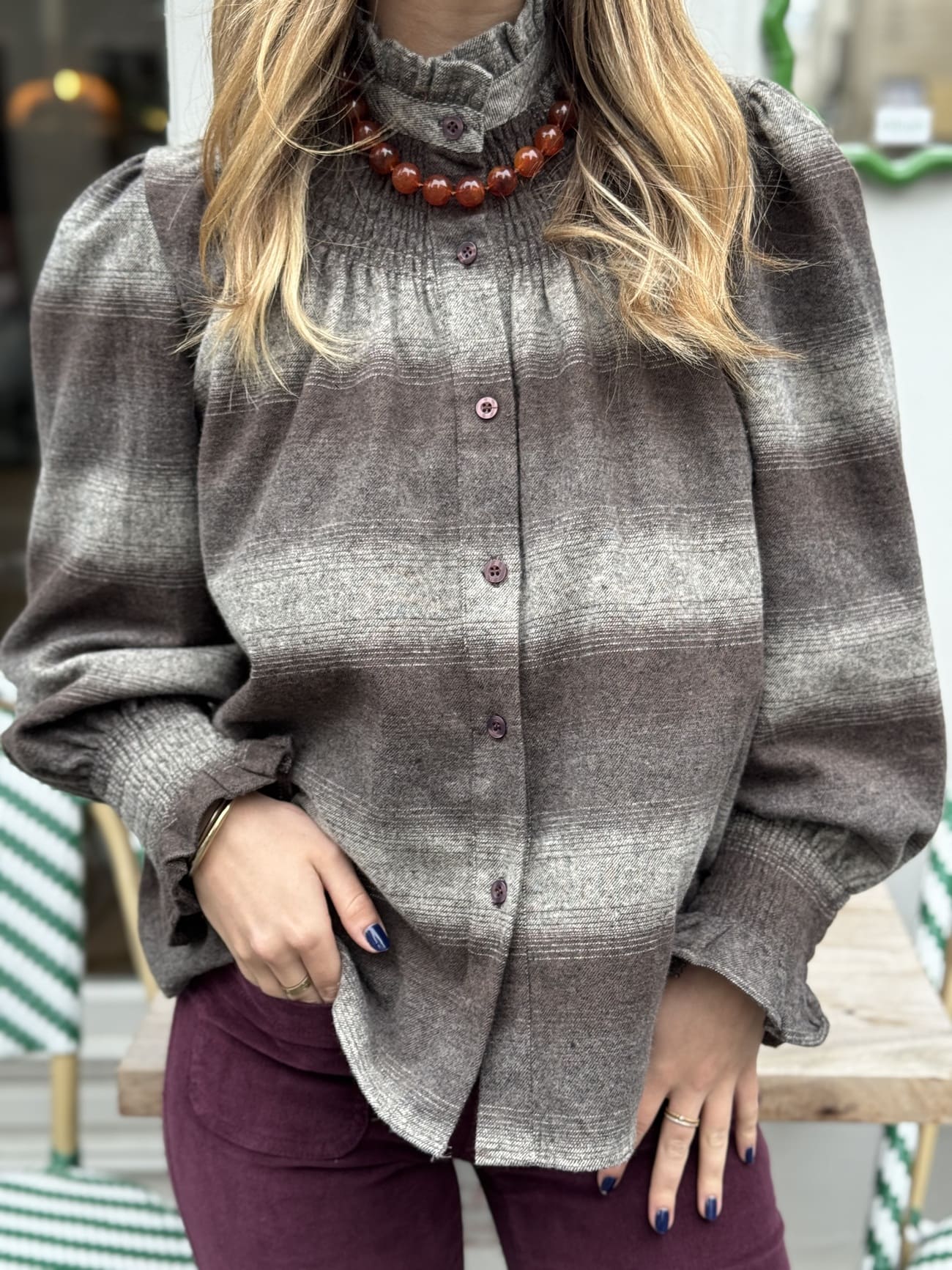 Cette chemise grise dégradée apporte une touche raffinée et féminine à votre garde-robe. Son col victorien à volants délicats et son toucher doux la rendent parfaite pour allier confort et style avec une note romantique et moderne.