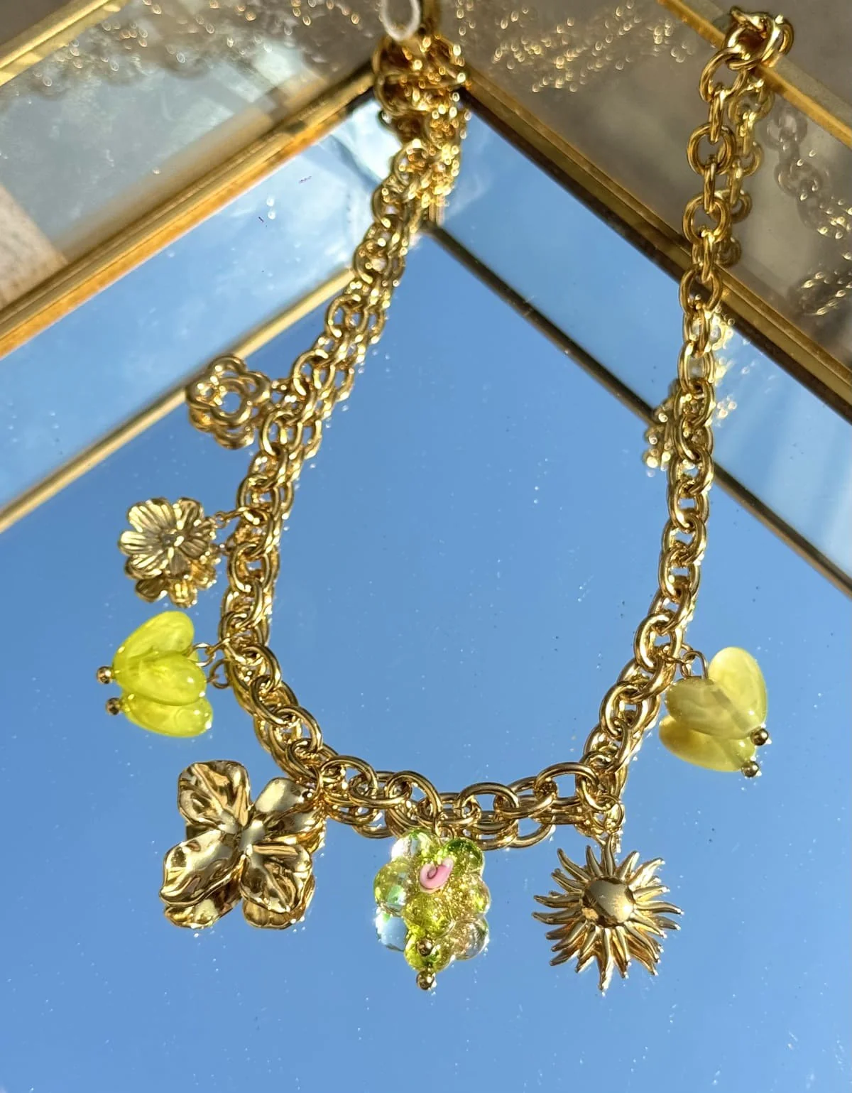 Laissez parler votre cœur avec le Collier Cœur Jaune. Ce bijou délicat et romantique mêle une chaîne dorée fine à des breloques en forme de cœur et fleurs, pour une touche audacieuse et féminine.