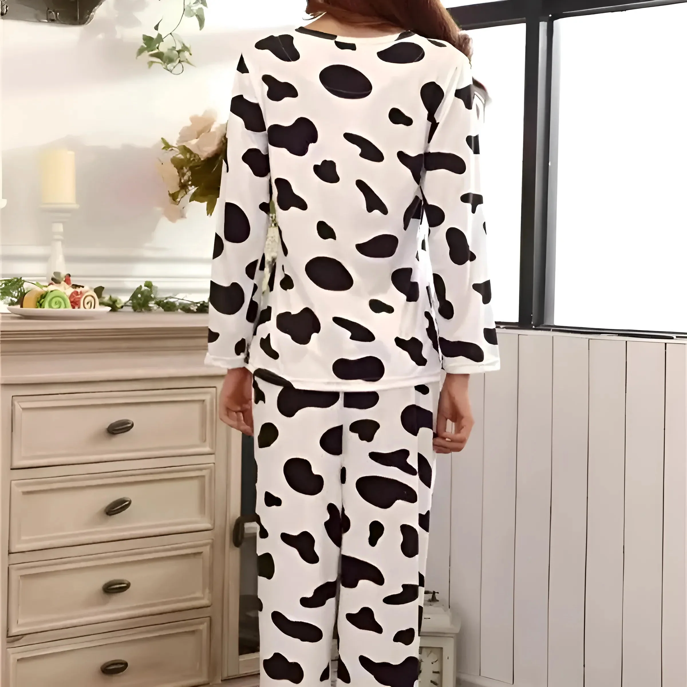 Adoptez votre style unique avec notre ensemble chic à imprimé vache noir et blanc, comprenant un haut confortable à manches longues et des pantalons longs pour un confort ultime. Enfilez ce style décontracté et laissez votre confiance briller—votre nouvelle tenue préférée vous attend !