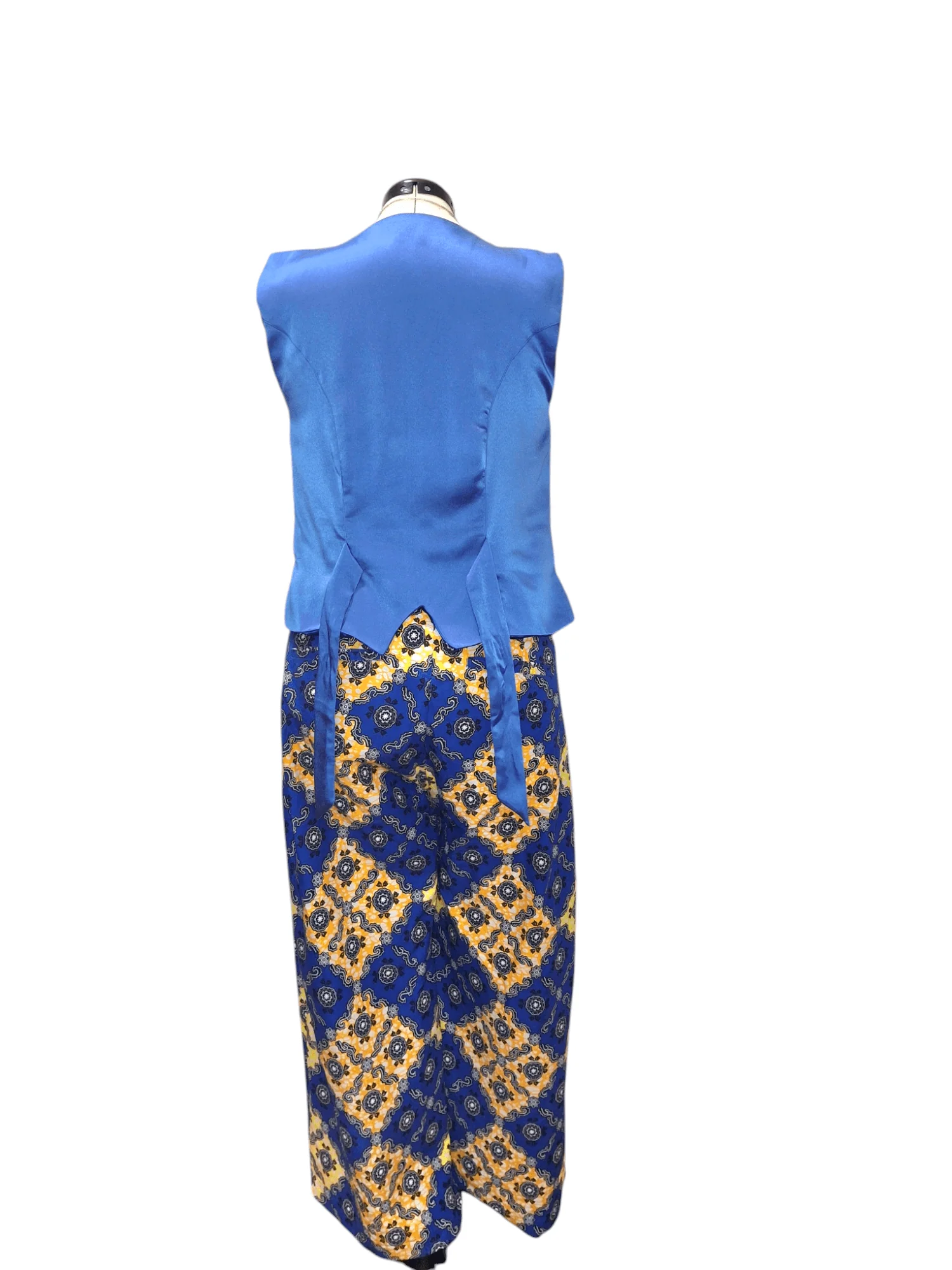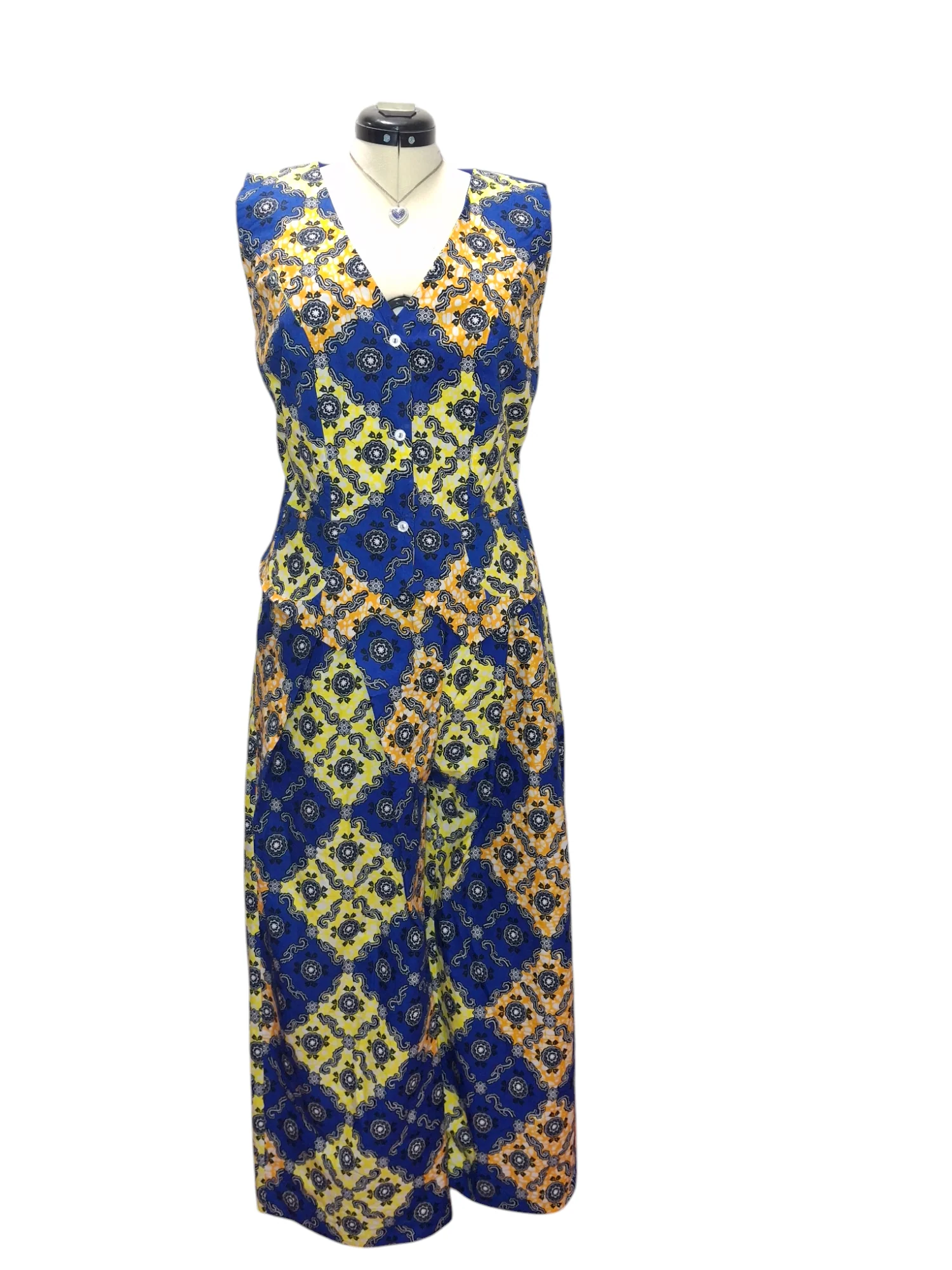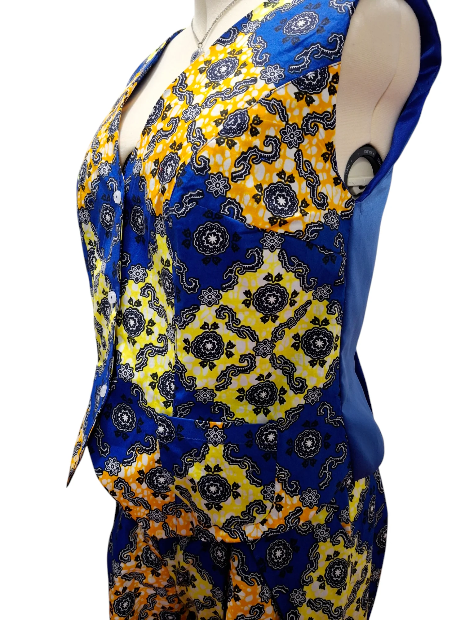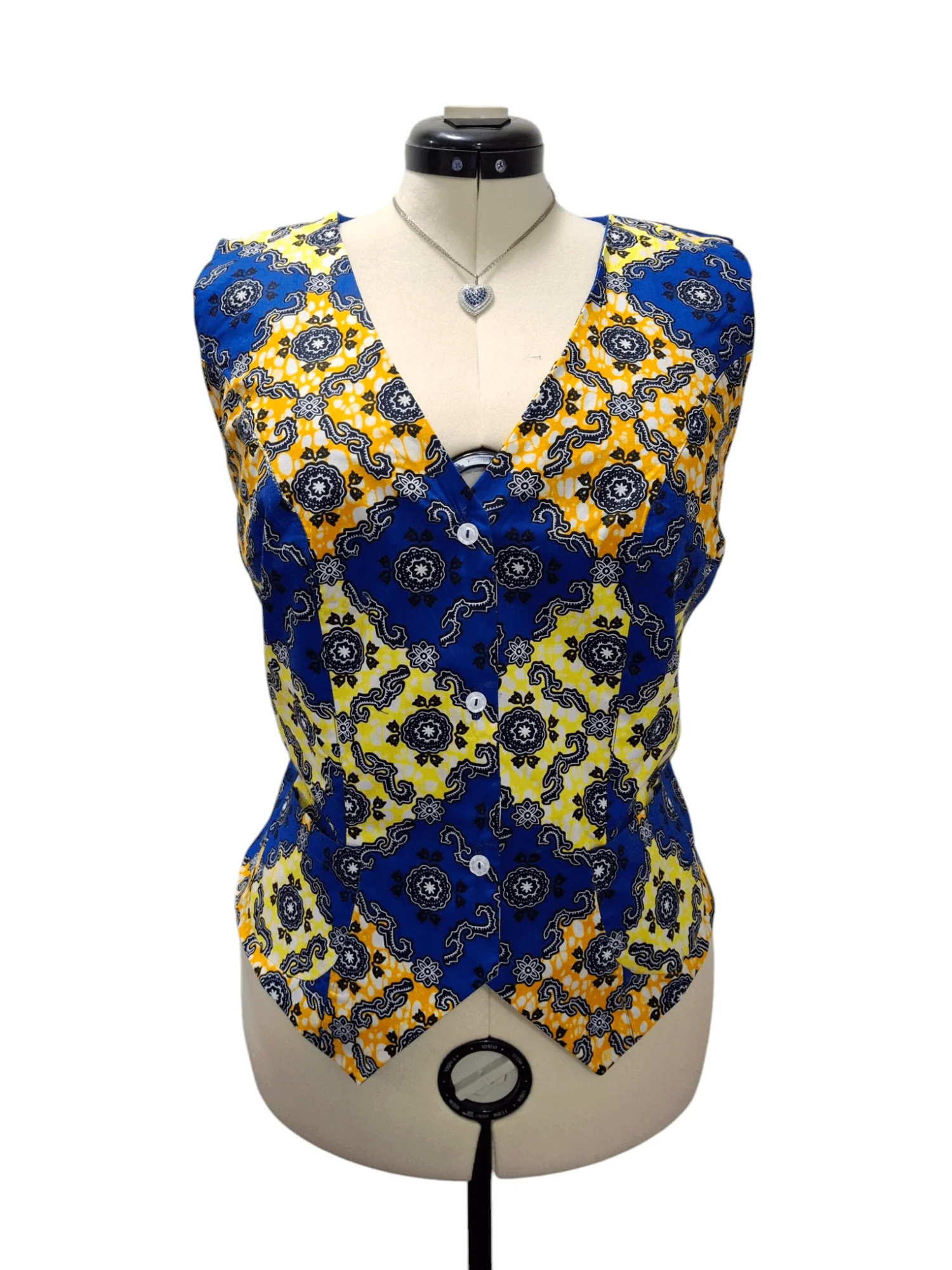 Ajoutez une touche de peps à votre garde-robe avec ce gilet sans manche tendance. Conçu avec un dos en satin ce gilet offre un toucher soyeux et un confort exceptionnel. L’avant du gilet ce distingue par son motif vibrant en super wax, apportant une touche d’audace et de couleur à votre tenue.