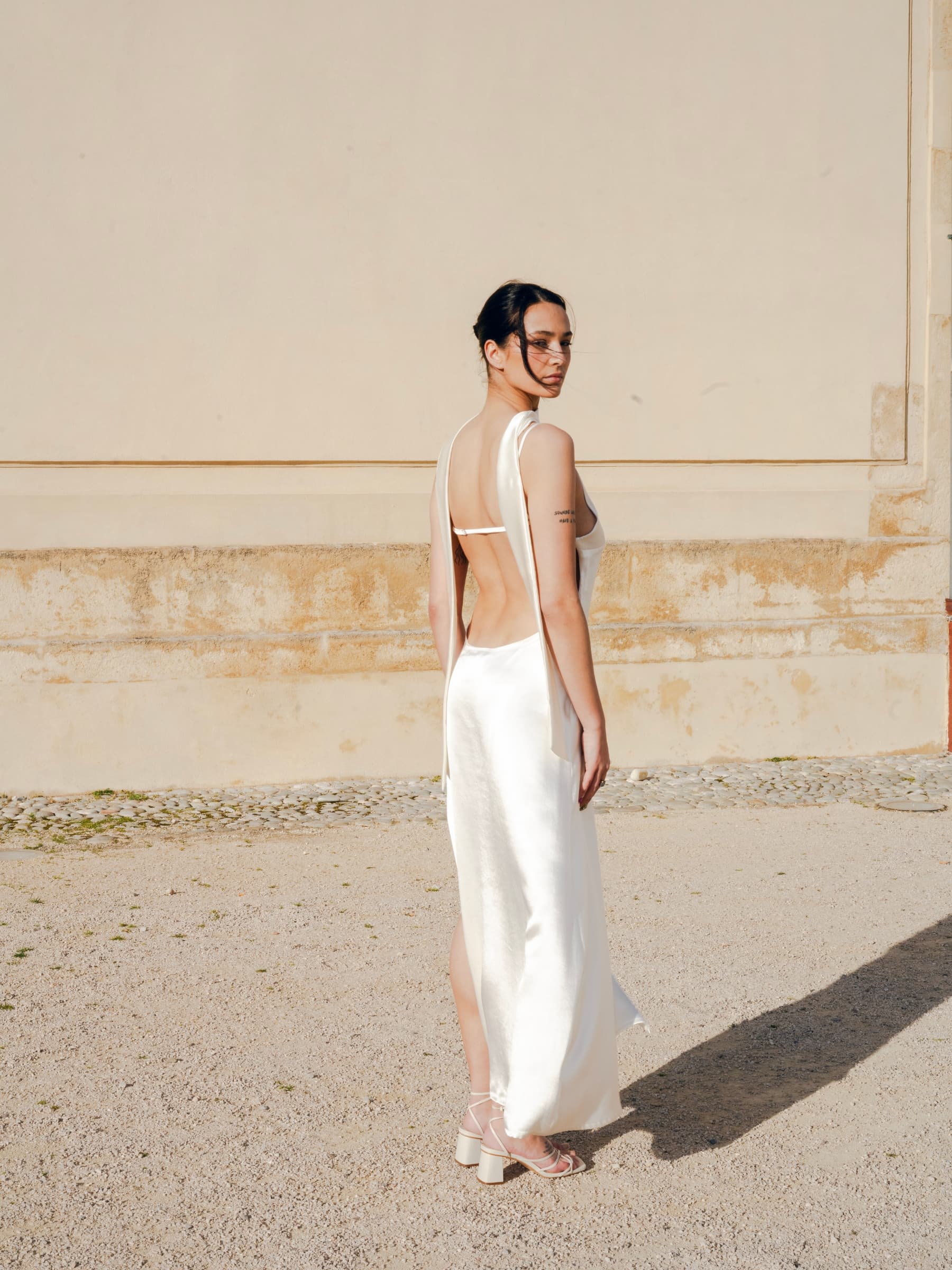 La Robe Naomi, disponible en noir et crème, est une robe longue en satin qui allie élégance et confort. Elle présente une coupe trapèze avec un dos nu élégant et une chute de rein qui souligne délicatement la silhouette. Ses bretelles ajustables et la fente latérale gauche apportent confort et mettent en valeur la silhouette, tout en garantissant une liberté de mouvement.
