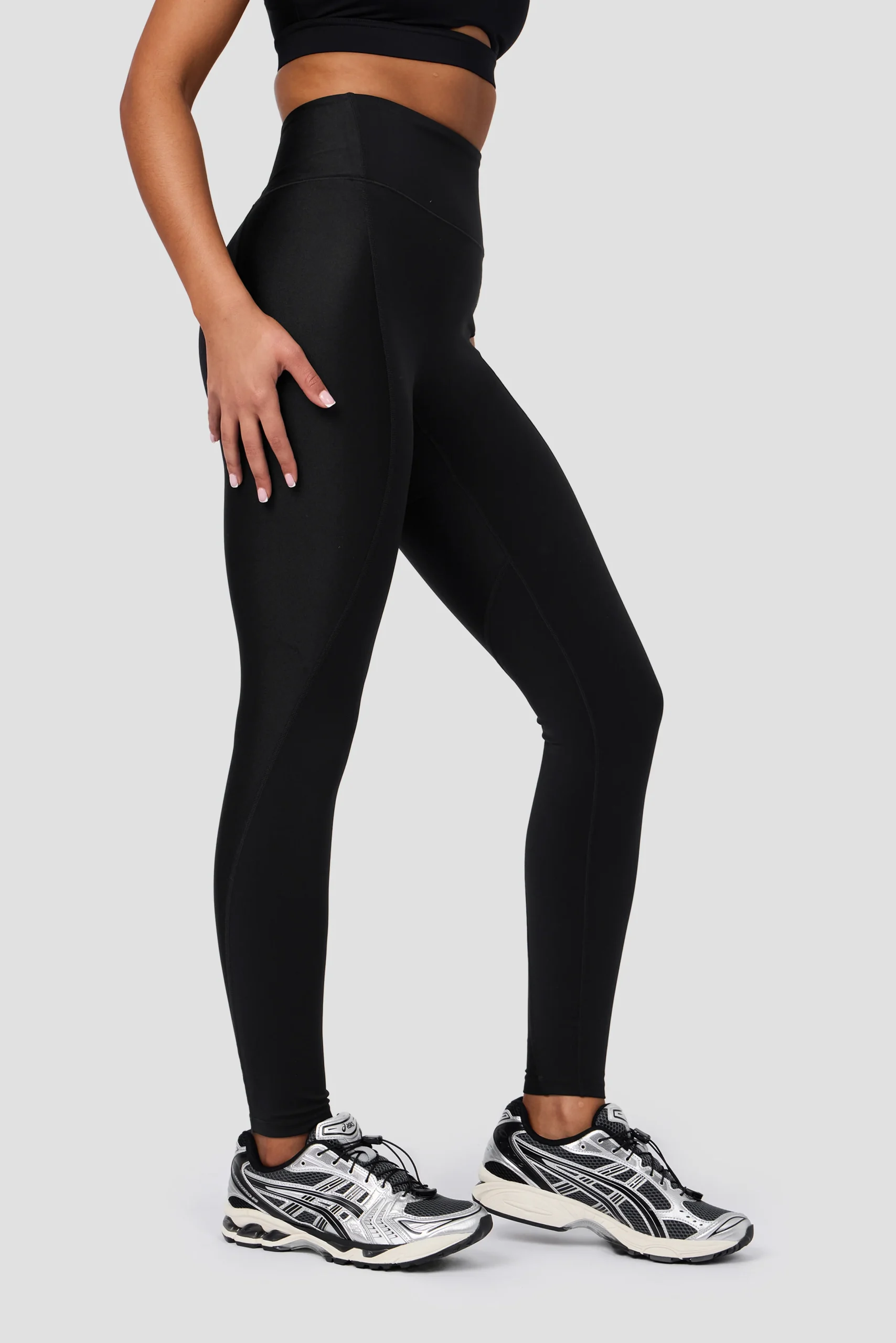 Engineered for performance and style, these leggings feature a standard fit with shine fabric side panels, back shaping detail, and gel logos for a sleek, modern look.
