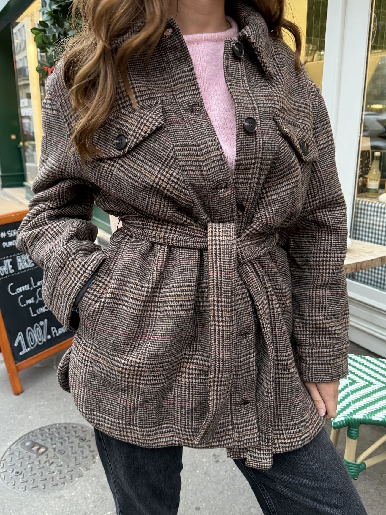 Portez ce manteau femme Prince de Galles sur un gilet beige ou gilet camel et un pantalon en velours bordeaux. Ajoutez un sac en cuir bohème chic.