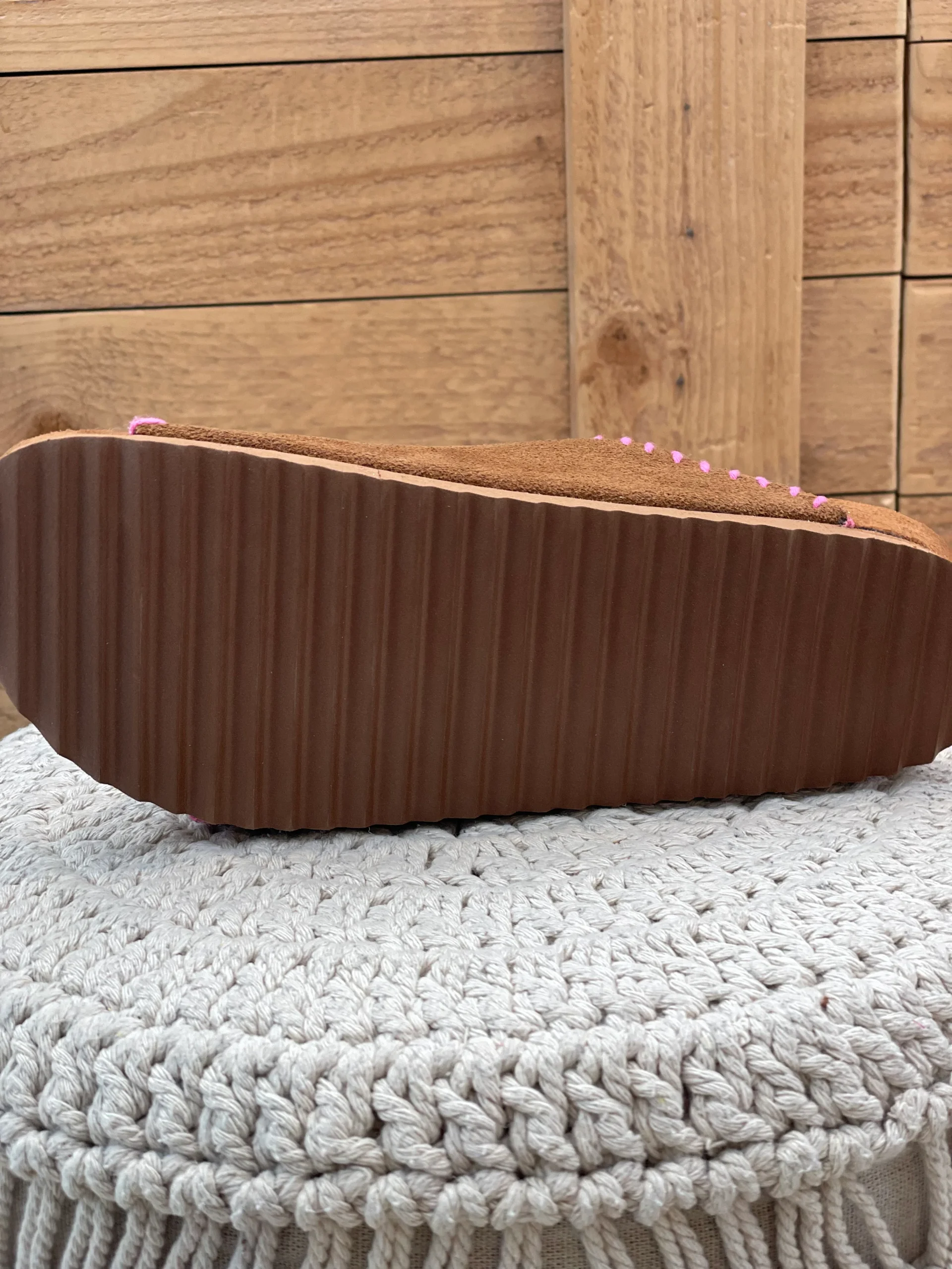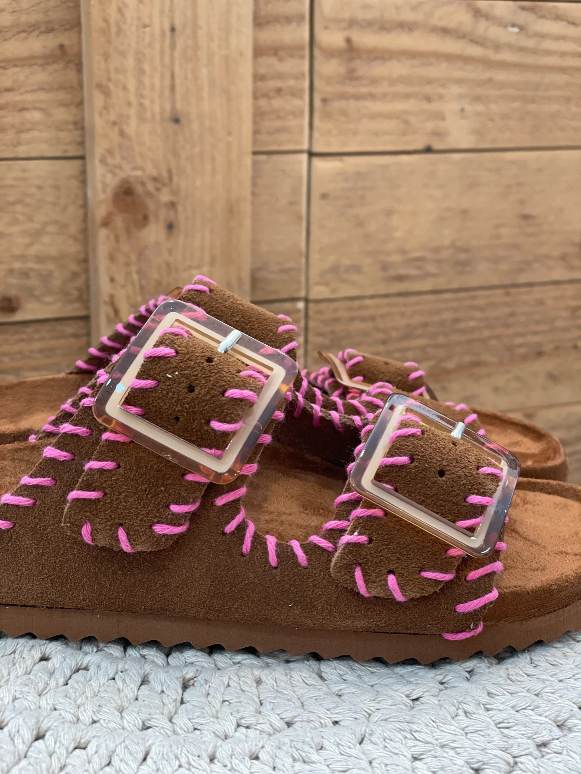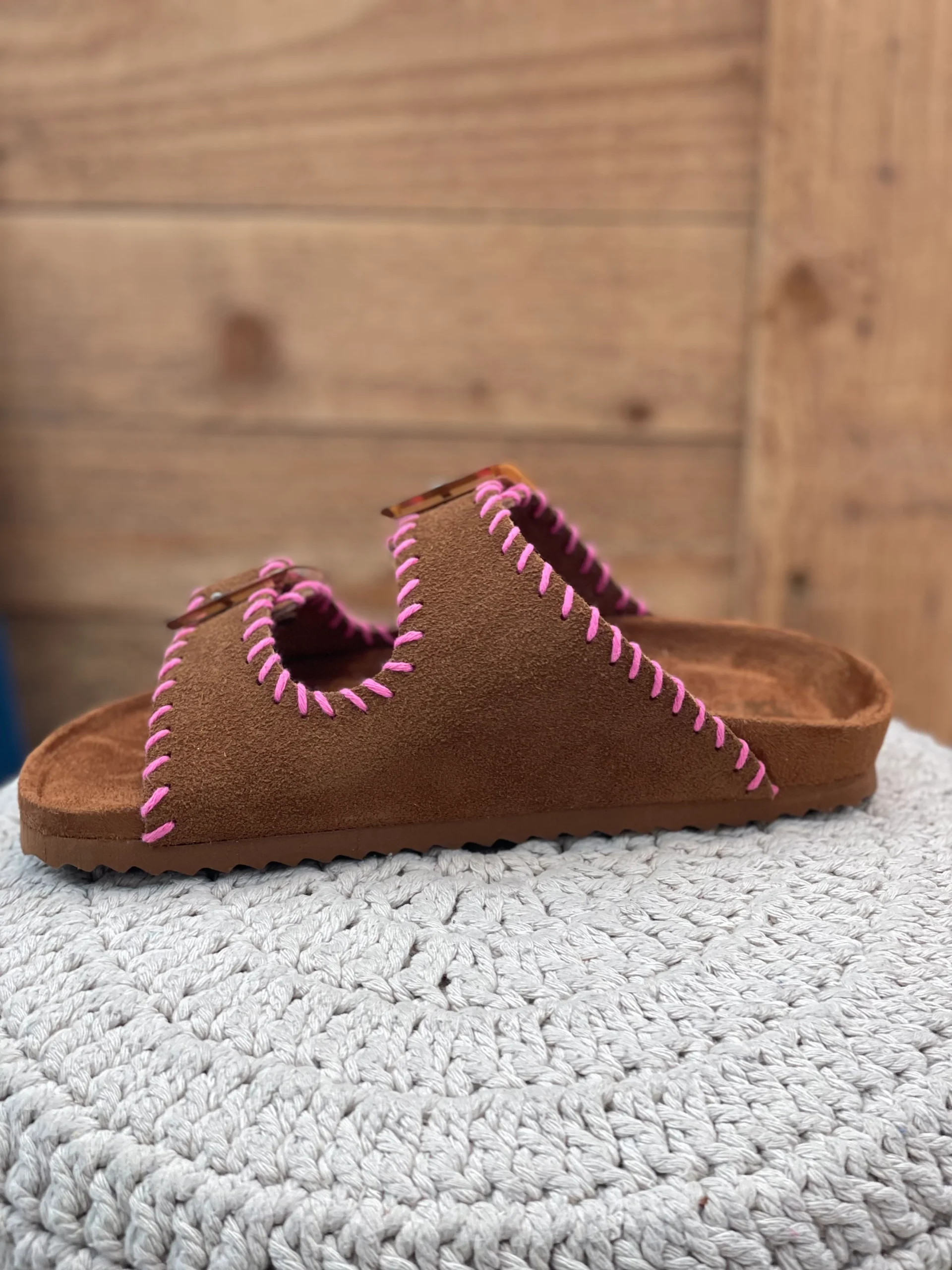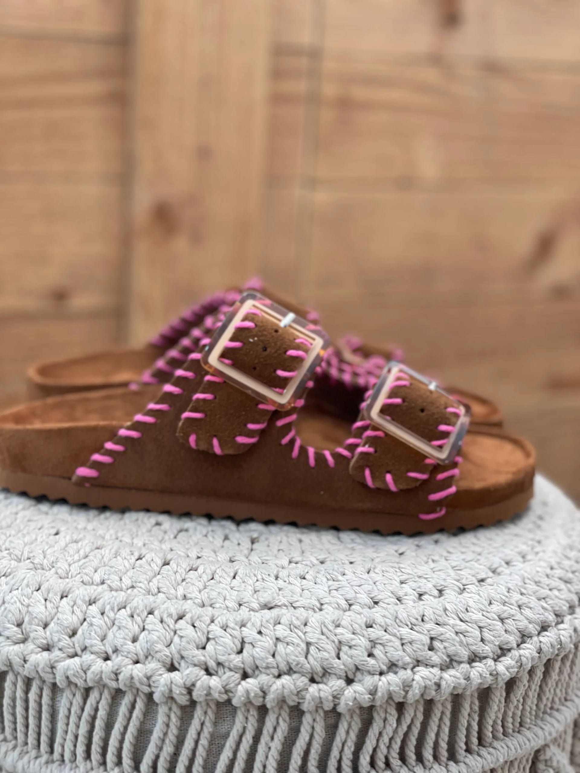 Ajoutez une touche de fantaisie à vos tenues estivales avec la mule Douce Prairie. Confectionnée en suédine marron toute douce, elle est rehaussée d’une couture décorative en fil rose vif qui apporte une note artisanale et pétillante. Ses deux larges brides sont réglables grâce à de grandes boucles en plastique transparent pour un ajustement parfait. Sa semelle plate en caoutchouc offre confort et stabilité pour un usage quotidien, en intérieur comme à l’extérieur.