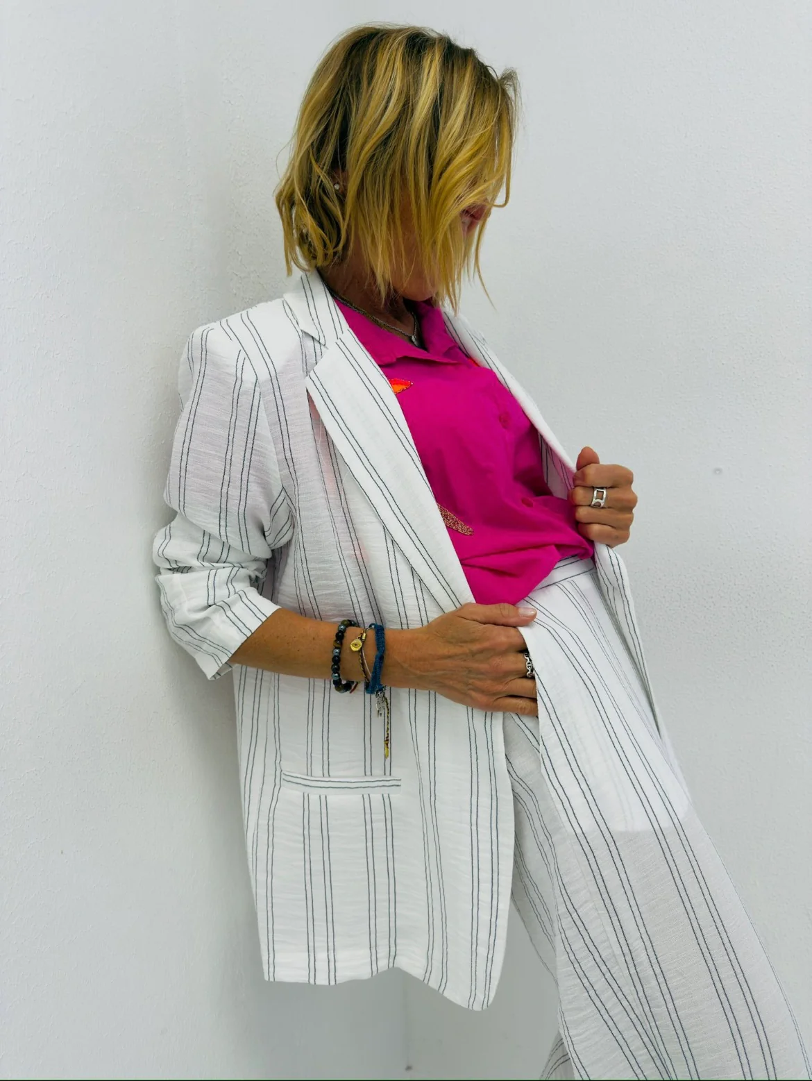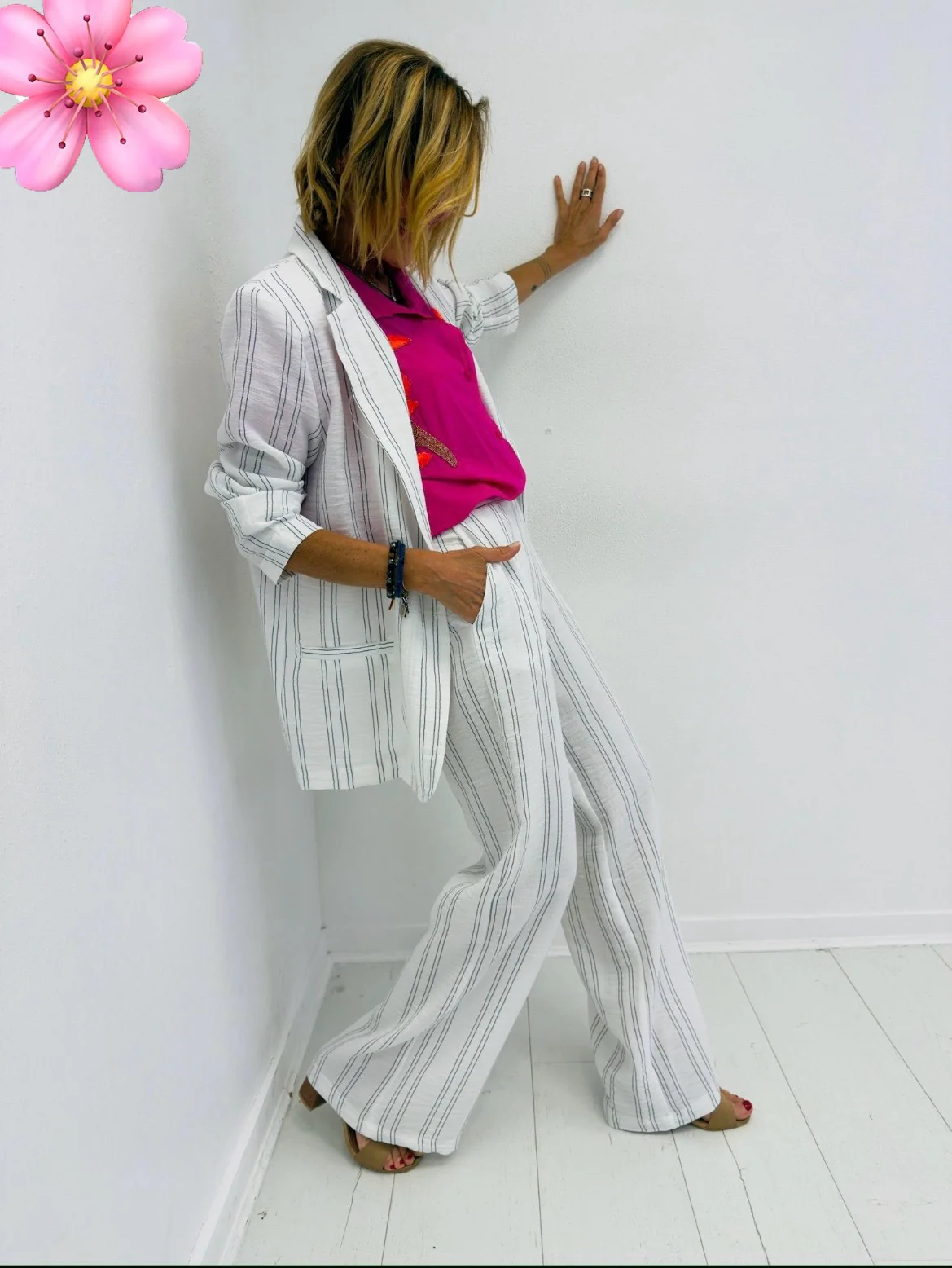 Avec sa taille haute, sa coupe droite et son tissu léger, il flatte toutes les silhouettes tout en offrant un confort absolu. Les fines rayures verticales allongent la jambe et apportent une touche de sophistication naturelle. Idéal porté avec un top coloré pour jouer les contrastes ou avec la veste assortie pour un total look affirmé.