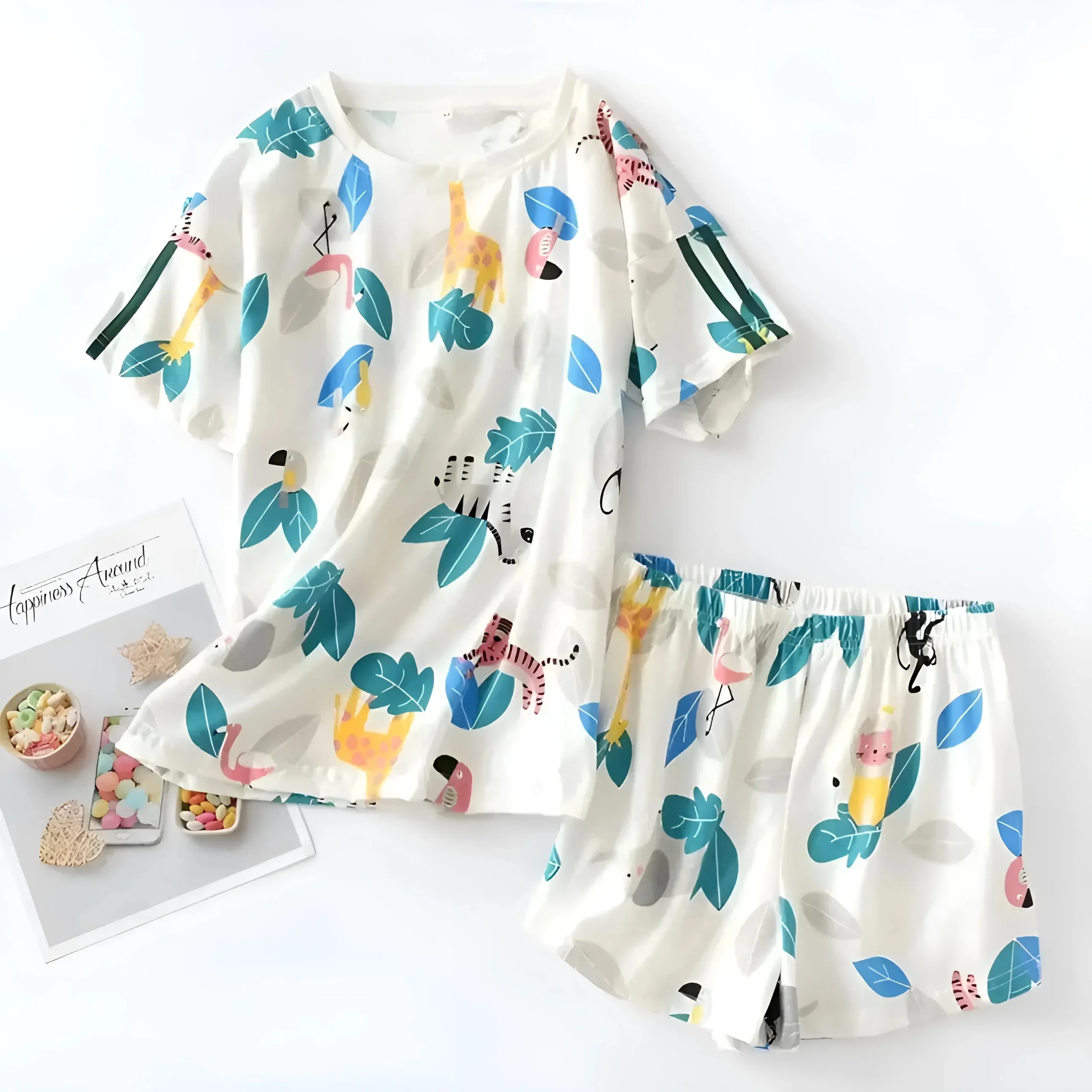 - L’autre ensemble a des imprimés colorés d’animaux et de feuilles.