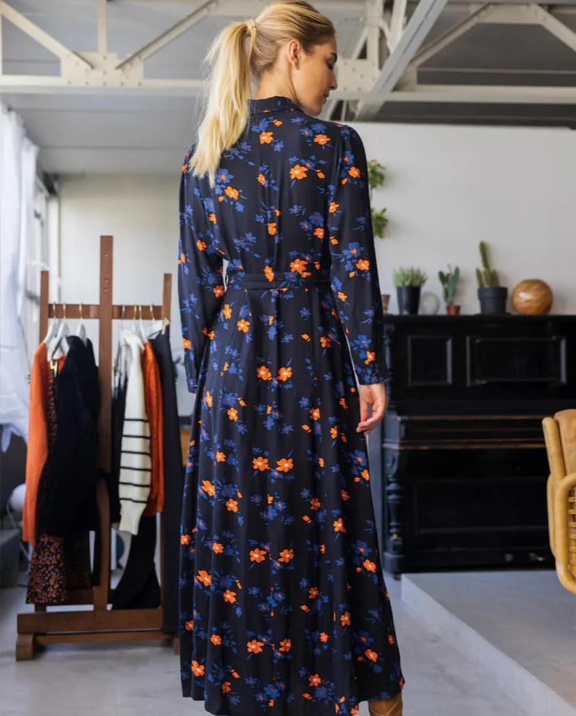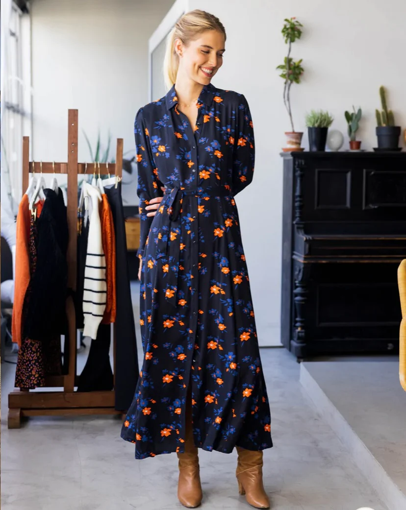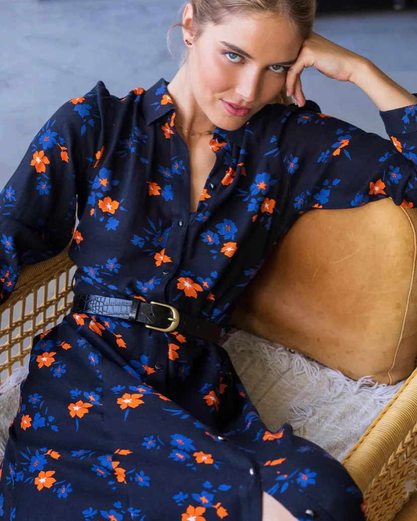 Longue robe façon saharienne Coupe longue et évasée Tissu fluide fleuri Col chemise et manches 3/4 À boutonner sur tout le devant Ruban amovible à nouer dans les passant Deux poches sur les côtés Modèle déposé COMPOSITION: 100% viscose