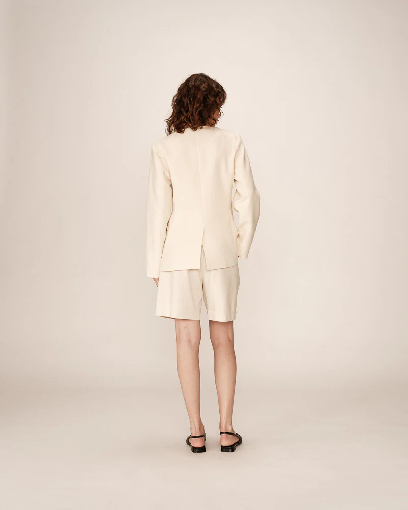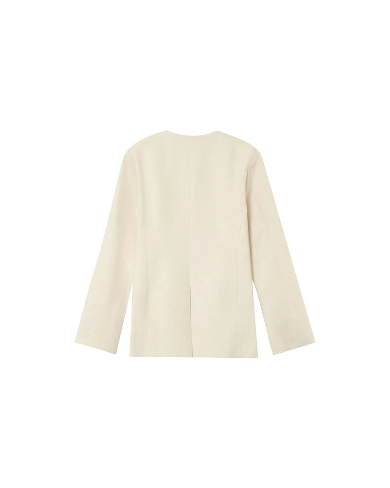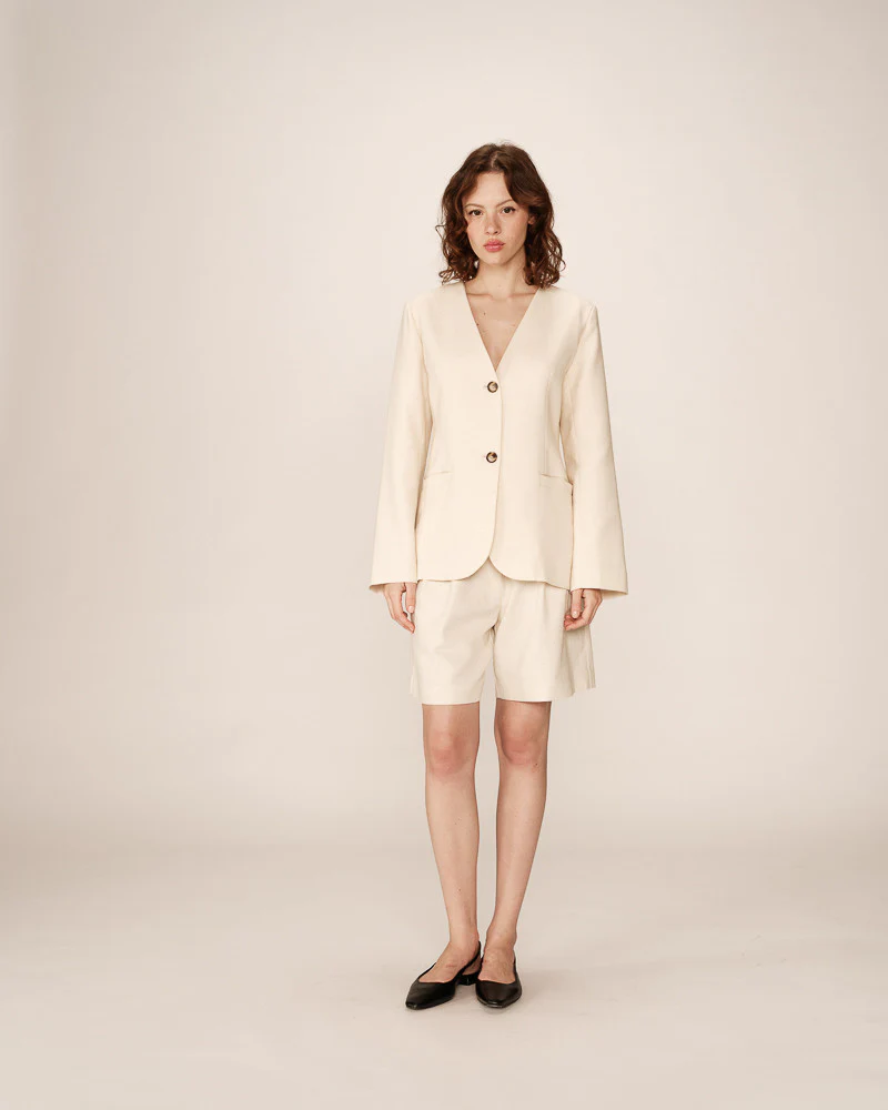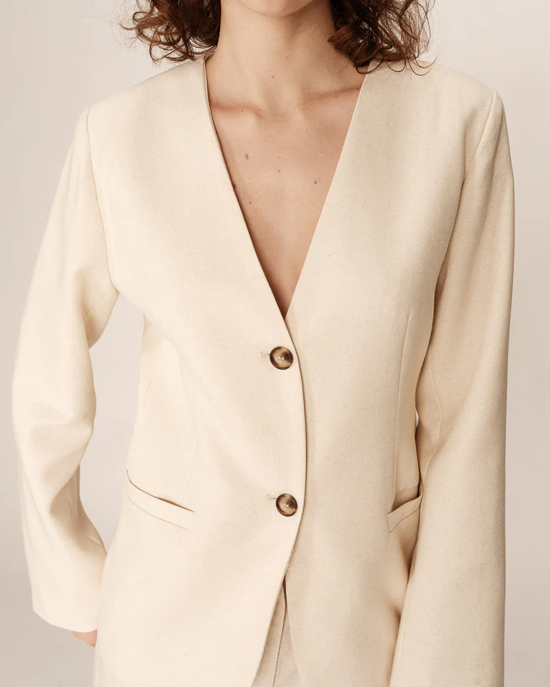 Un intemporel du vestiaire féminin-masculin avec originalité et propose la veste tailleur PAYTON. Avec ses lignes épurées et sa coupe minimaliste, cette pièce dessine une silhouette élégante et sophistiquée. La veste à manches longues PAYTON est sans col, a un simple boutonnage et des poches passepoilées sur le devant. La coupe ajustée et l’encolure en V rehausse la féminité du modèle et sublime la silhouette. Confectionnée en fibres naturelles, la veste PAYTON rejoint notre gamme en fibres naturelles ‘Un Brin de Vert’.