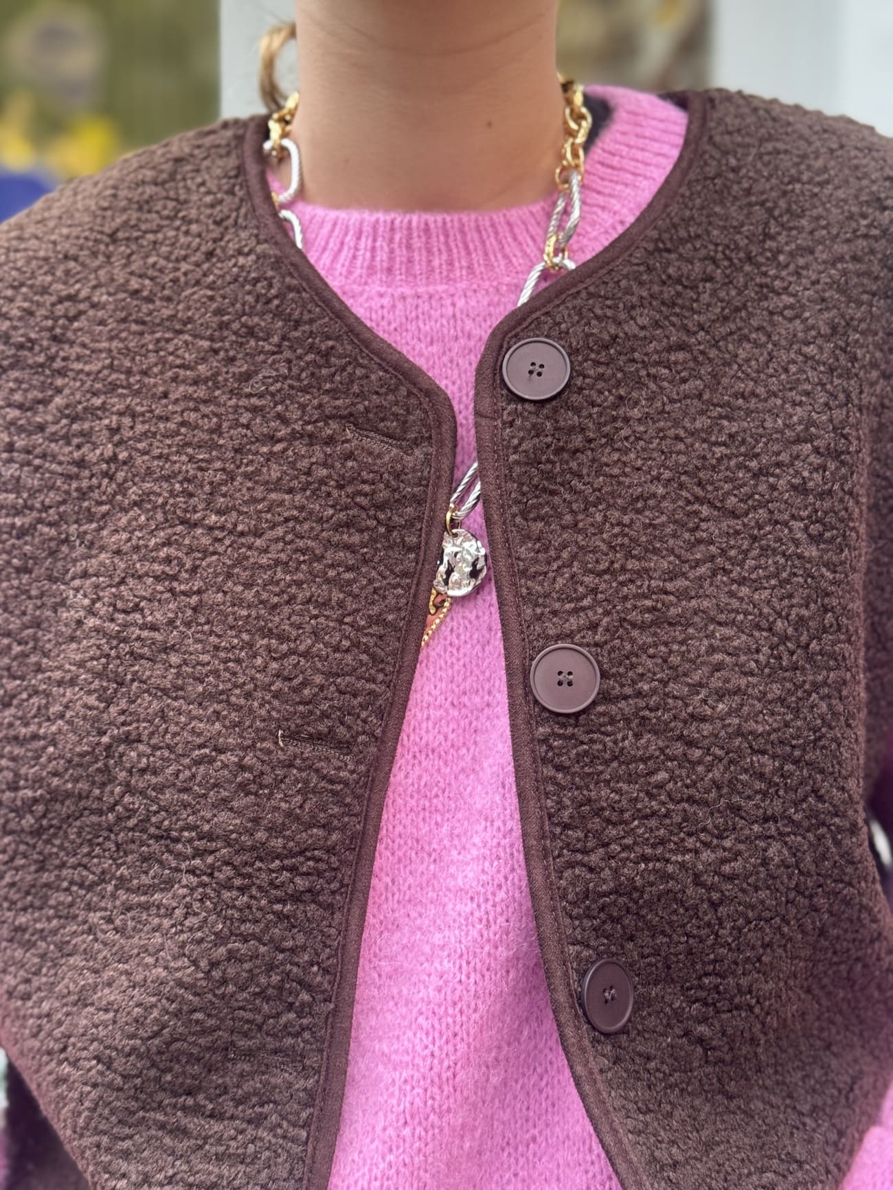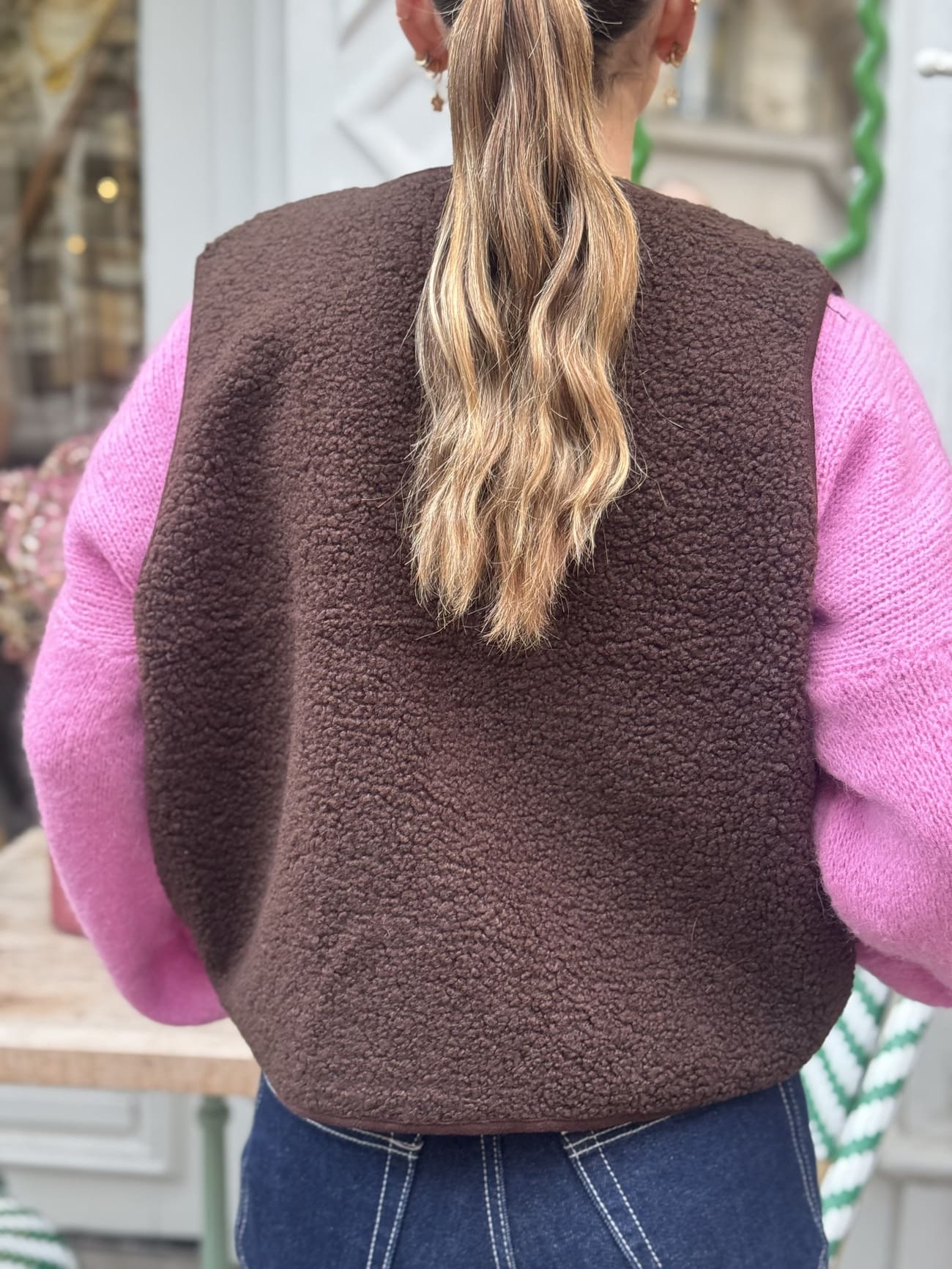 Cette veste sans manche marron en tissu sherpa enveloppe vos looks d’une chaleur naturelle. Sa couleur terre rappelle les tons de l’automne et s’associe facilement à vos basiques du quotidien.
